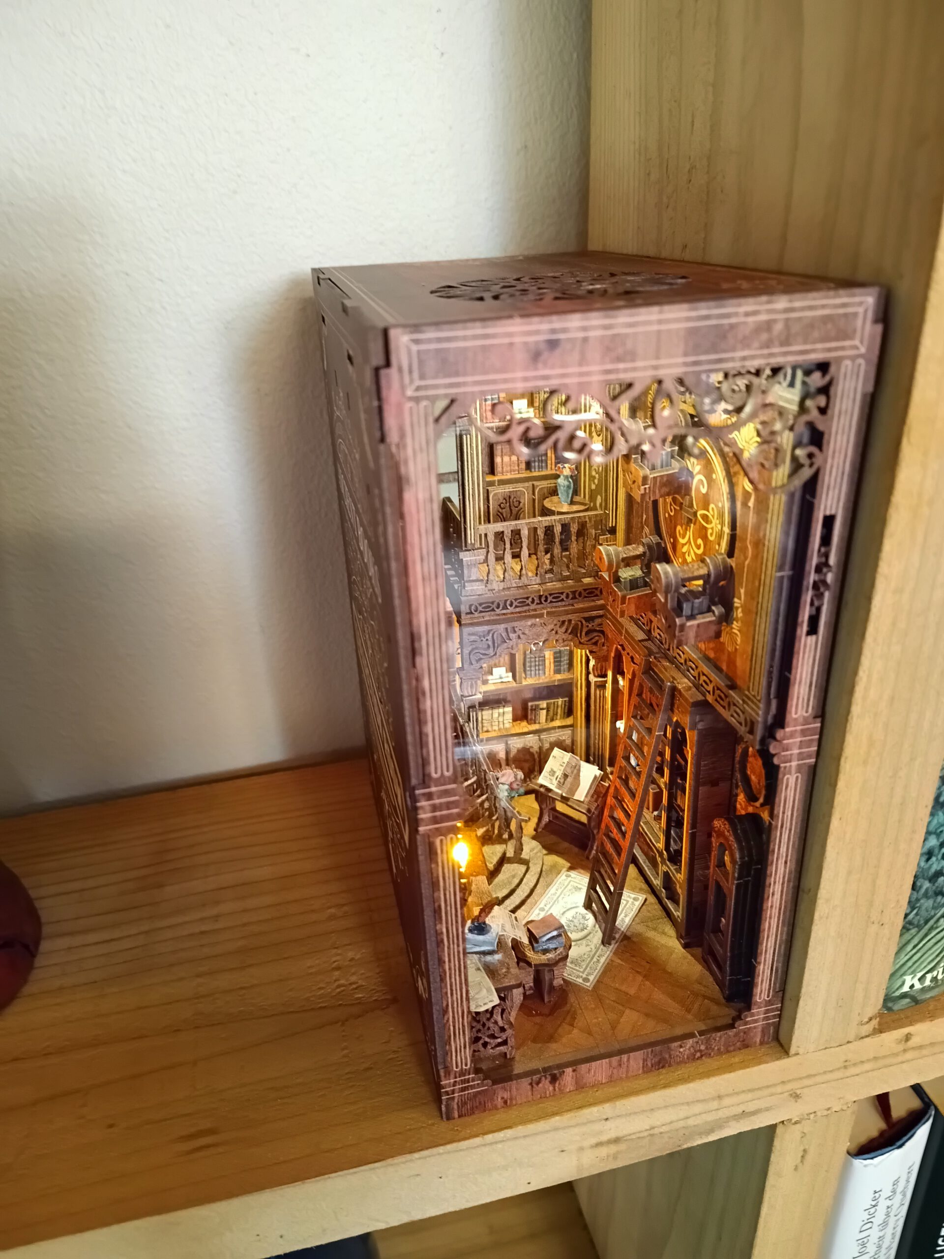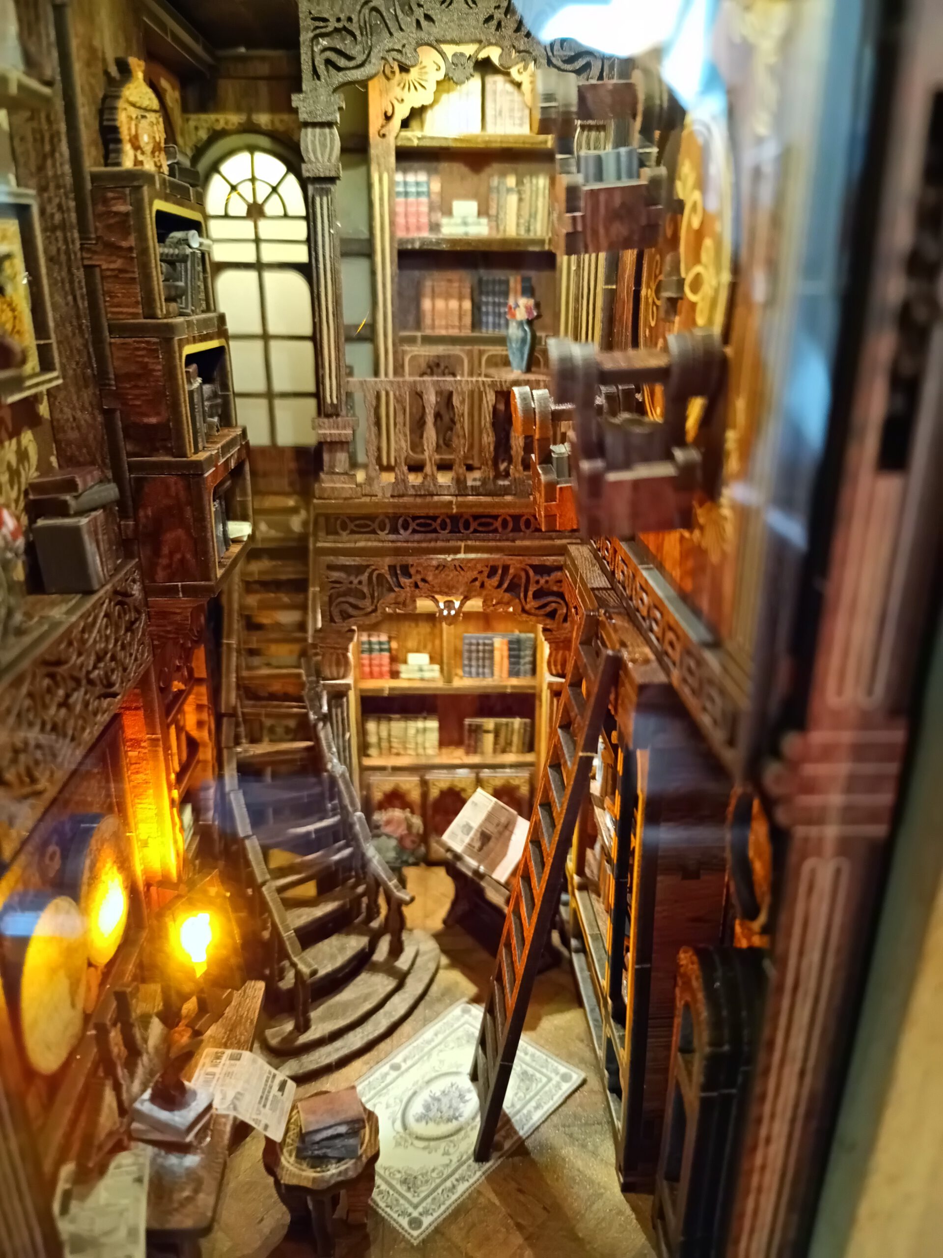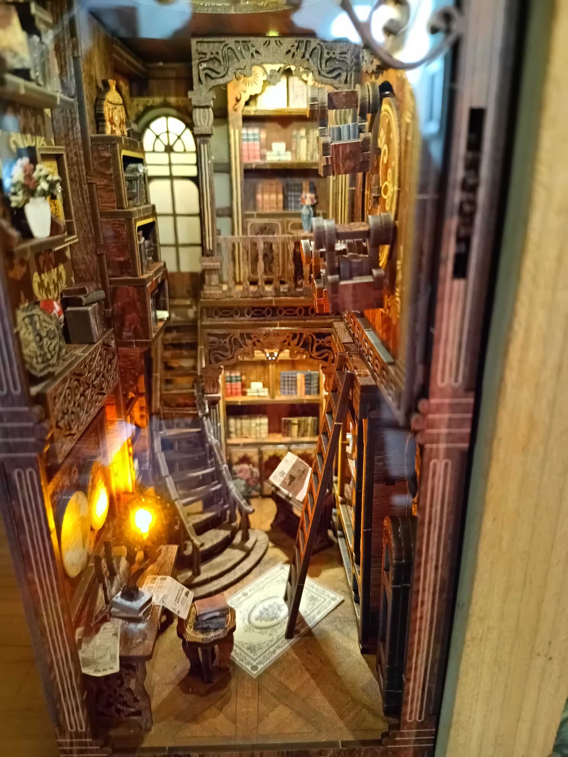 Eigentlich geht das Ganze darauf zurück, dass meine Herzdame sich vor längerer Zeit ein 3-D-Puzzle bestellt hatte, was aber nie geliefert wurde. Also habe ich ihr ein solches, wenn auch in anderer Form, im Internet besorgt. Ihre Begeisterung hielt sich aber leider in Grenzen, also habe ich mich über das Ding hergemacht. Es waren etliche hundert Teile, die aus den Trägern gebrochen und zusammengefügt werden mussten. Alleine schon hunderte von Büchern, die entstehen, indem man ein klitzekleines Abziehbildchen um einen klitzekleinen Holzklotz wickelt…. Aber das Ergebnis ist wirklich beeindruckend, eine unglaubliche Fülle an Details, und man kann damit ohne Probleme den einen oder anderen Regentag überstehen!