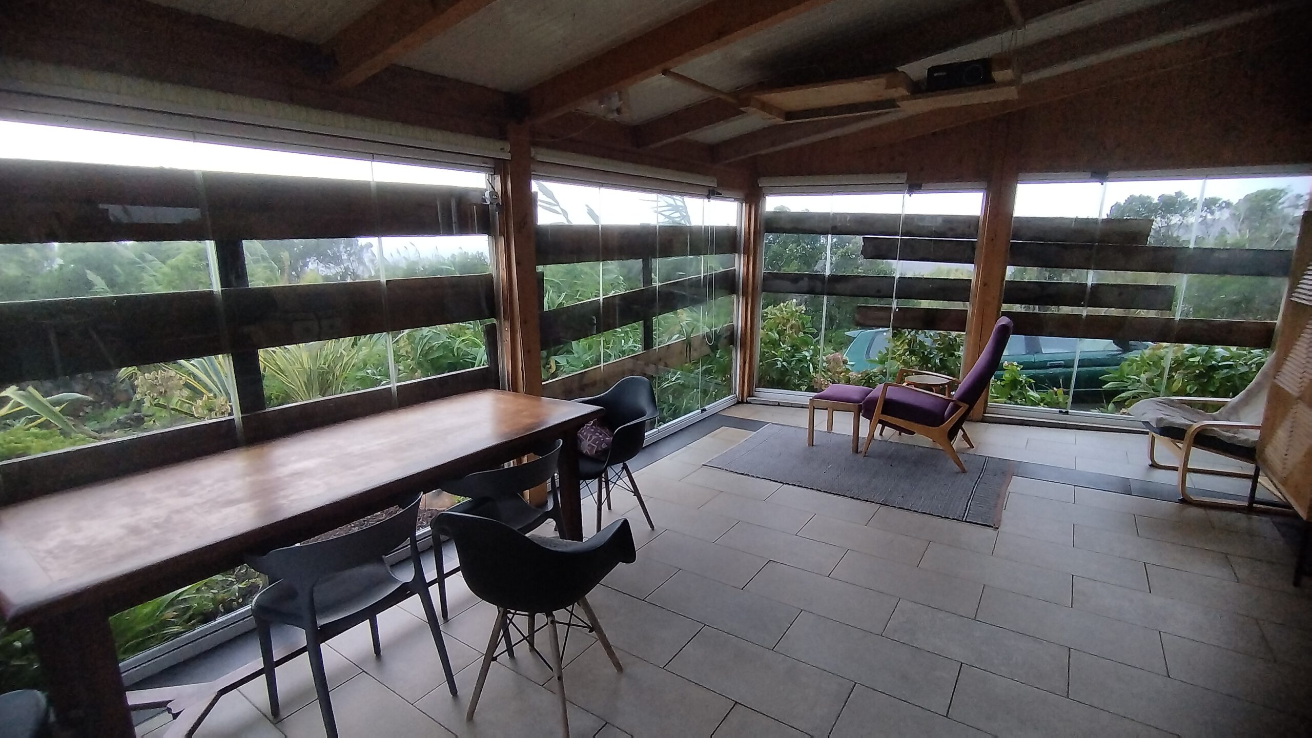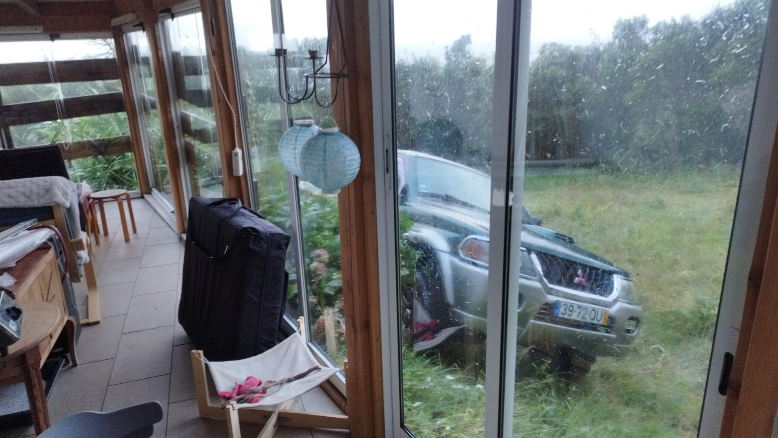 Ich habe, wie schon mehrfach bewährt, die Windlast auf den Wintergarten reduziert in dem ich rundum Bretter angeschraubt habe. Die Glas-elemente des Wintergartens sind gut für 80 Knoten Wind, also rund 150 Stundenkilometer.